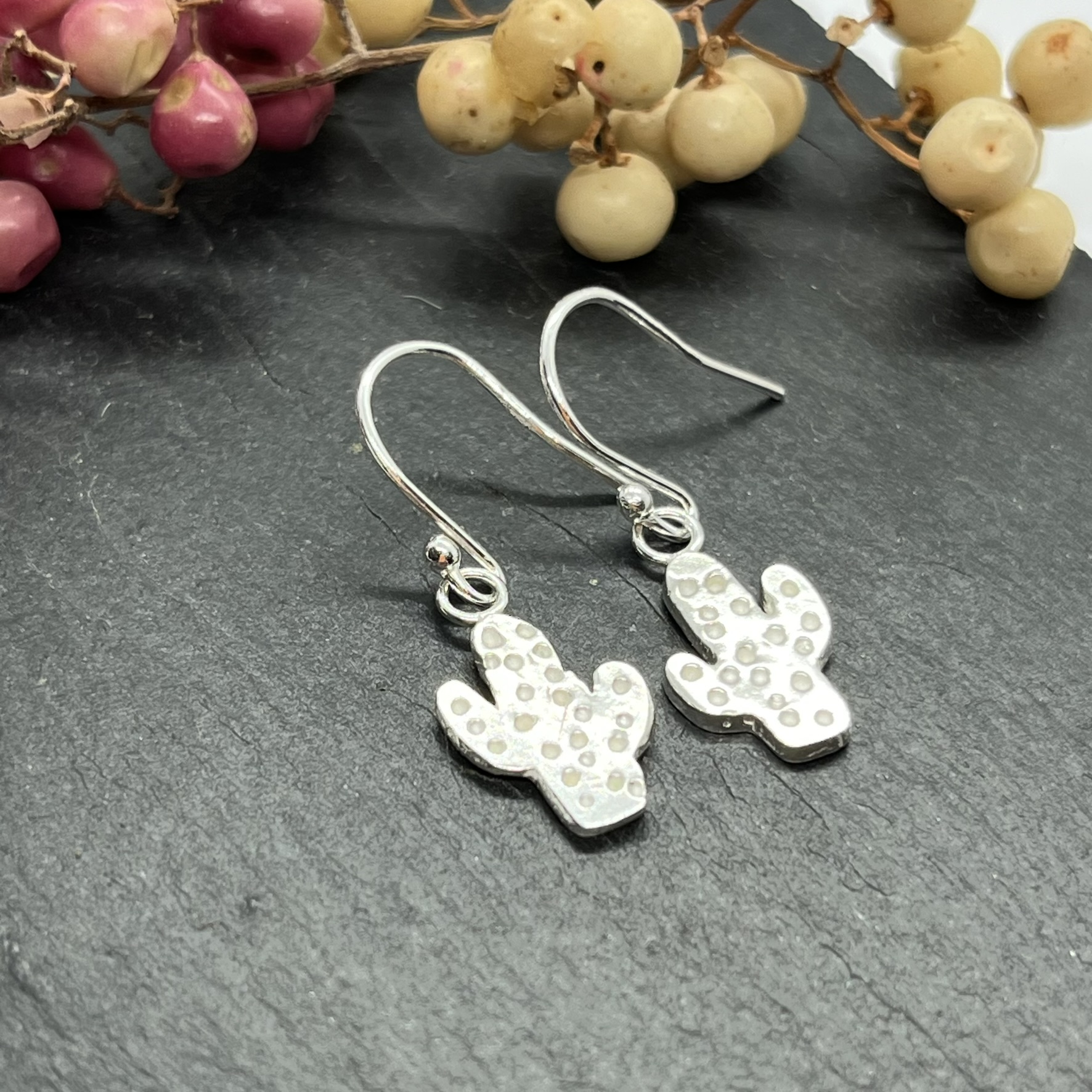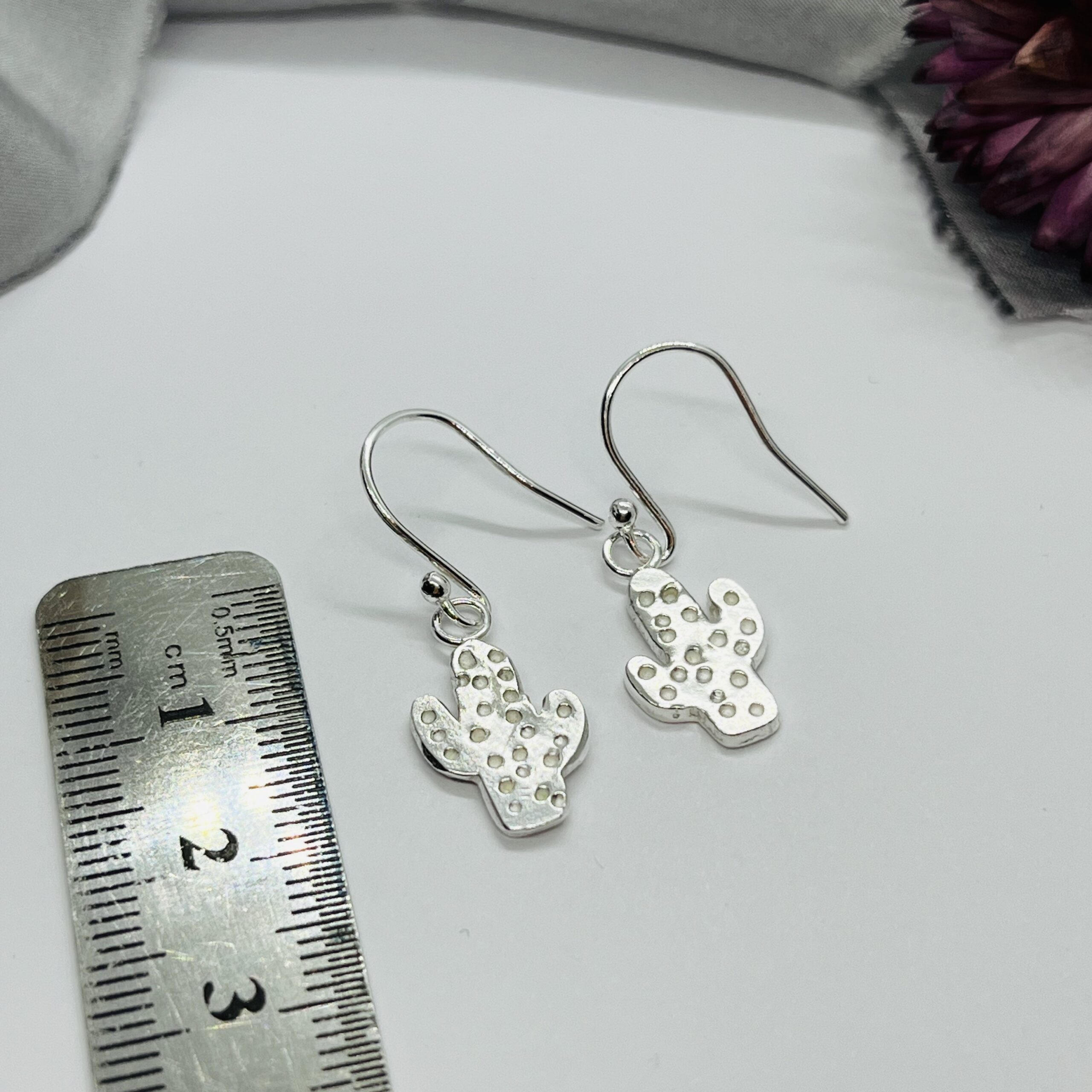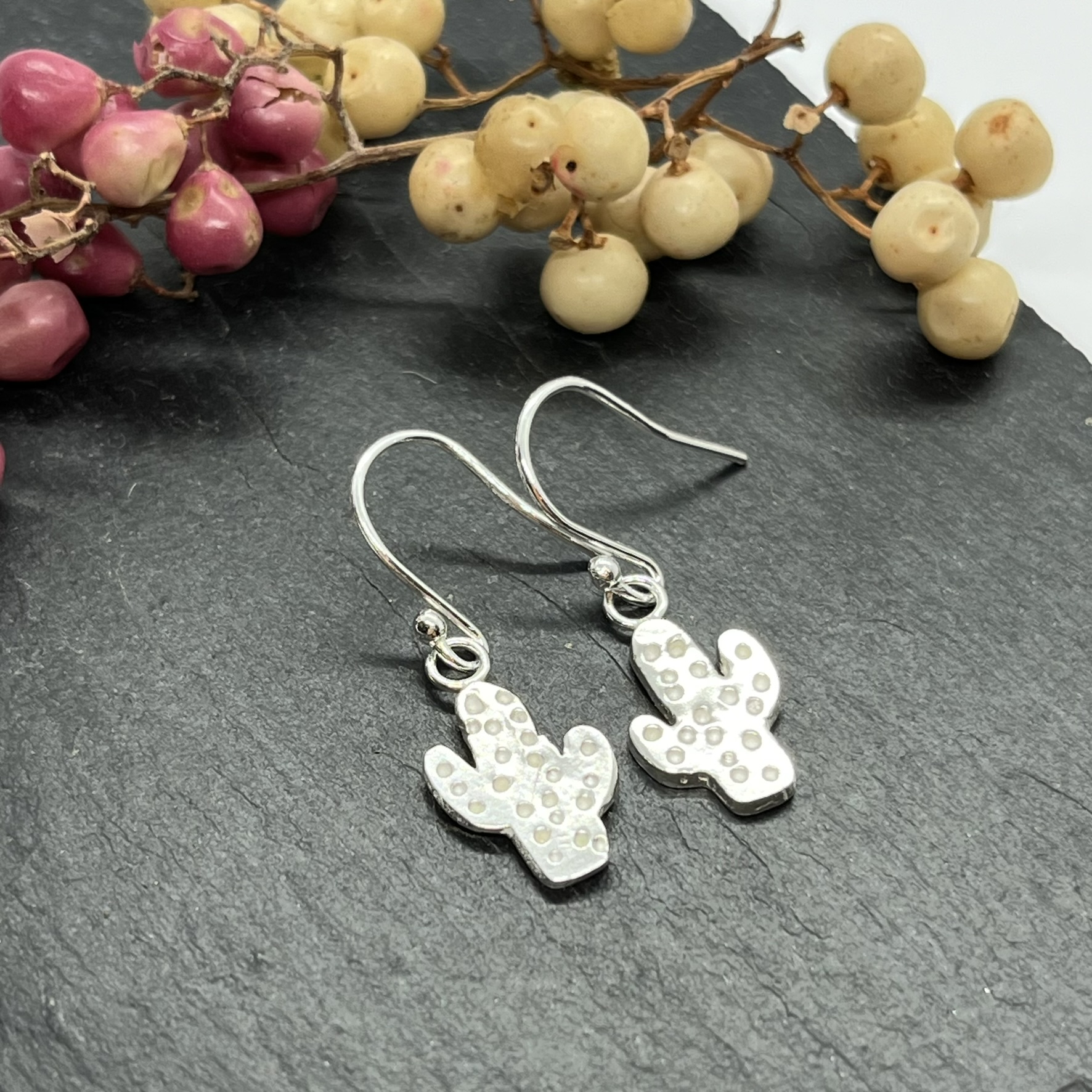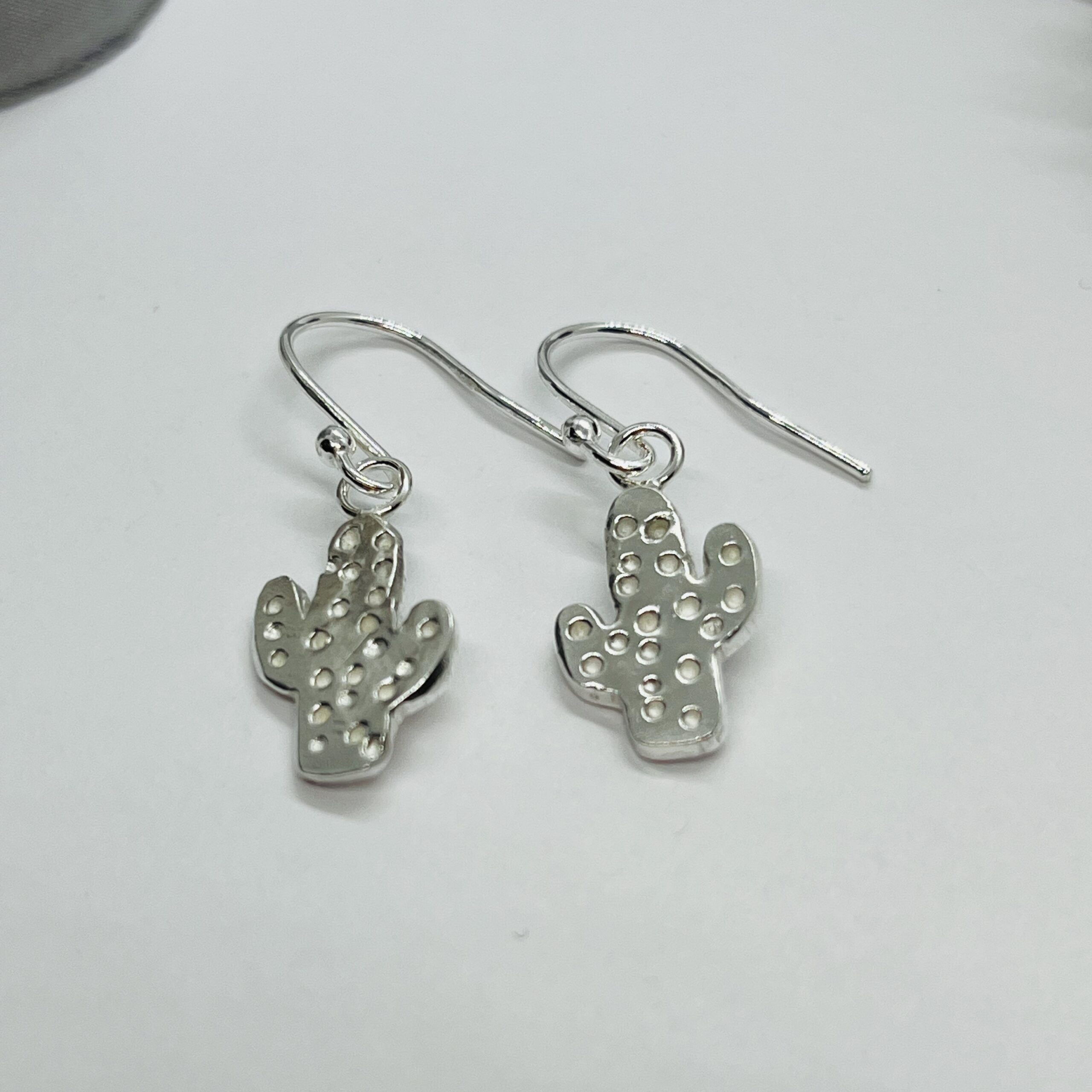 Each cactus is made from precious metal clay (PMC), which is fine particles of silver held in a binder, the PMC is shaped and then the binder is removed by firing the item in a kiln. The fine silver particles then fuse resulting in a solid fine silver piece. The ear wires are sterling silver.