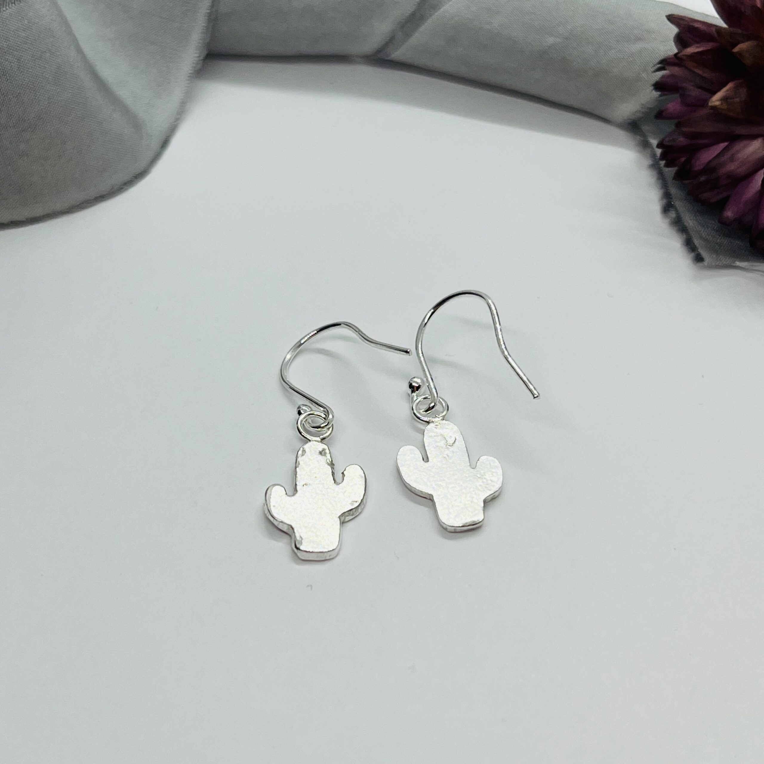Fine silver cactus drop earrings, handcrafted from recycled silver, these earrings are a unique design featuring a small, organically shaped cactus that dangles elegantly from the ear wire.