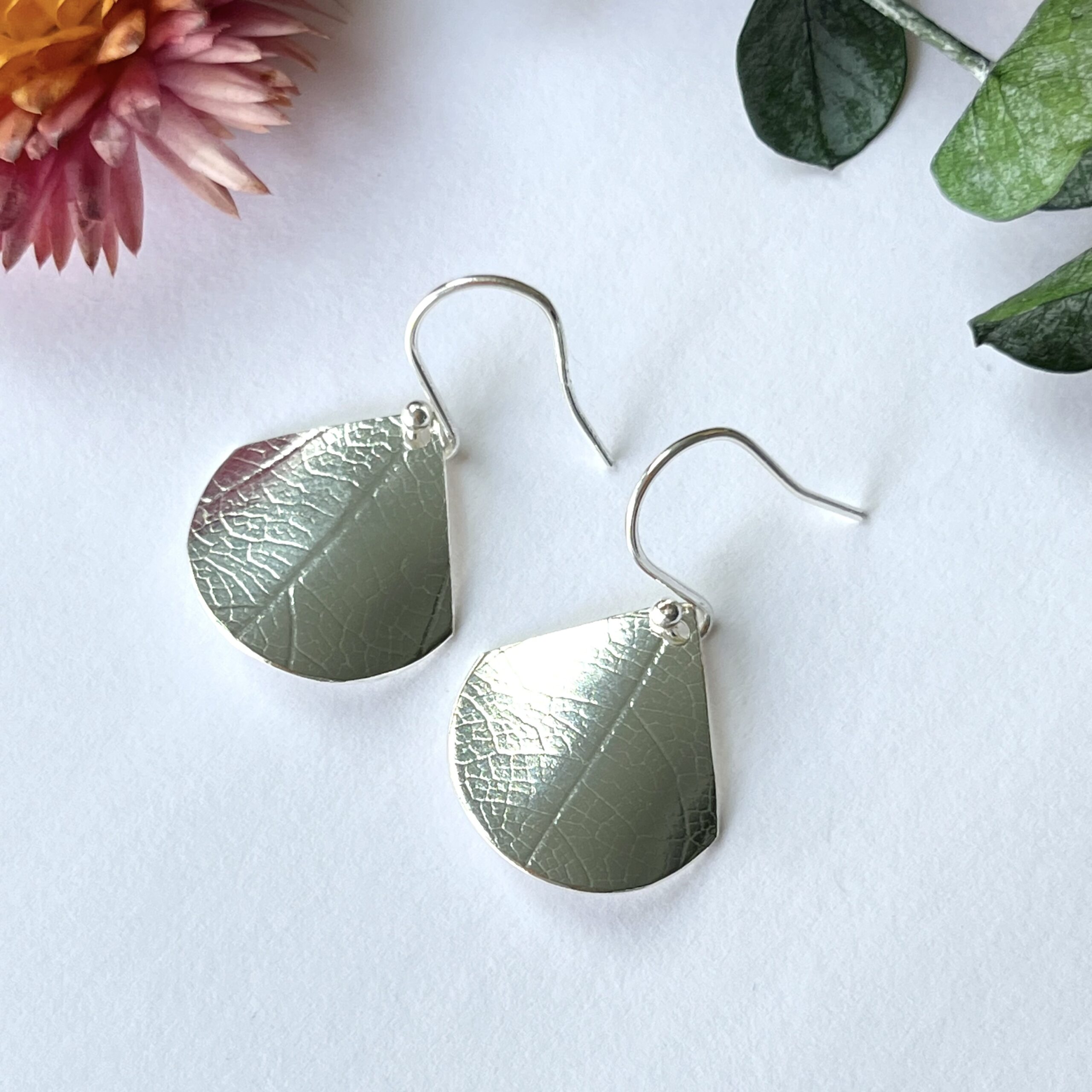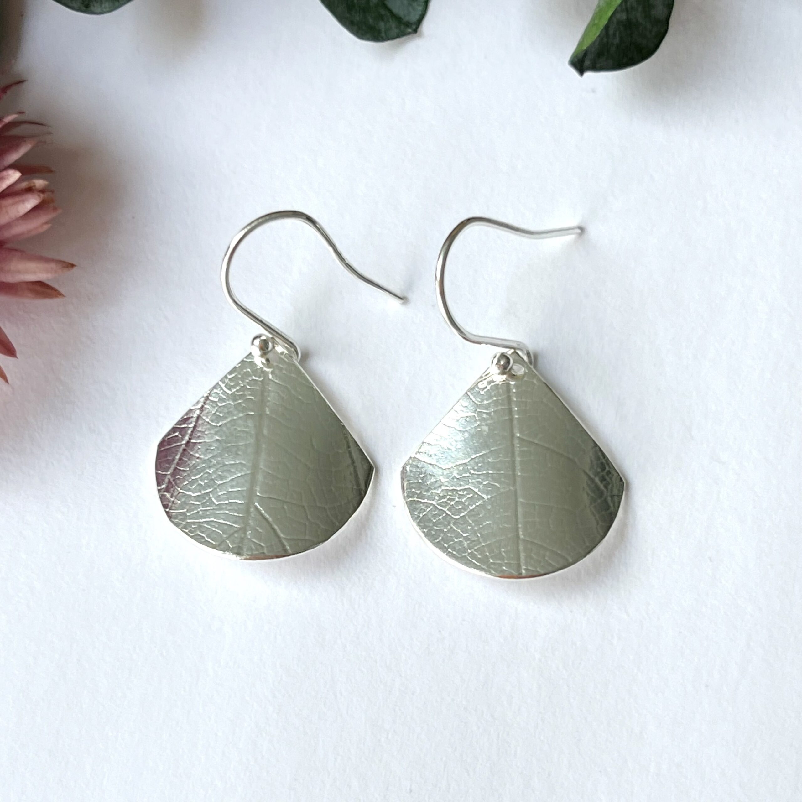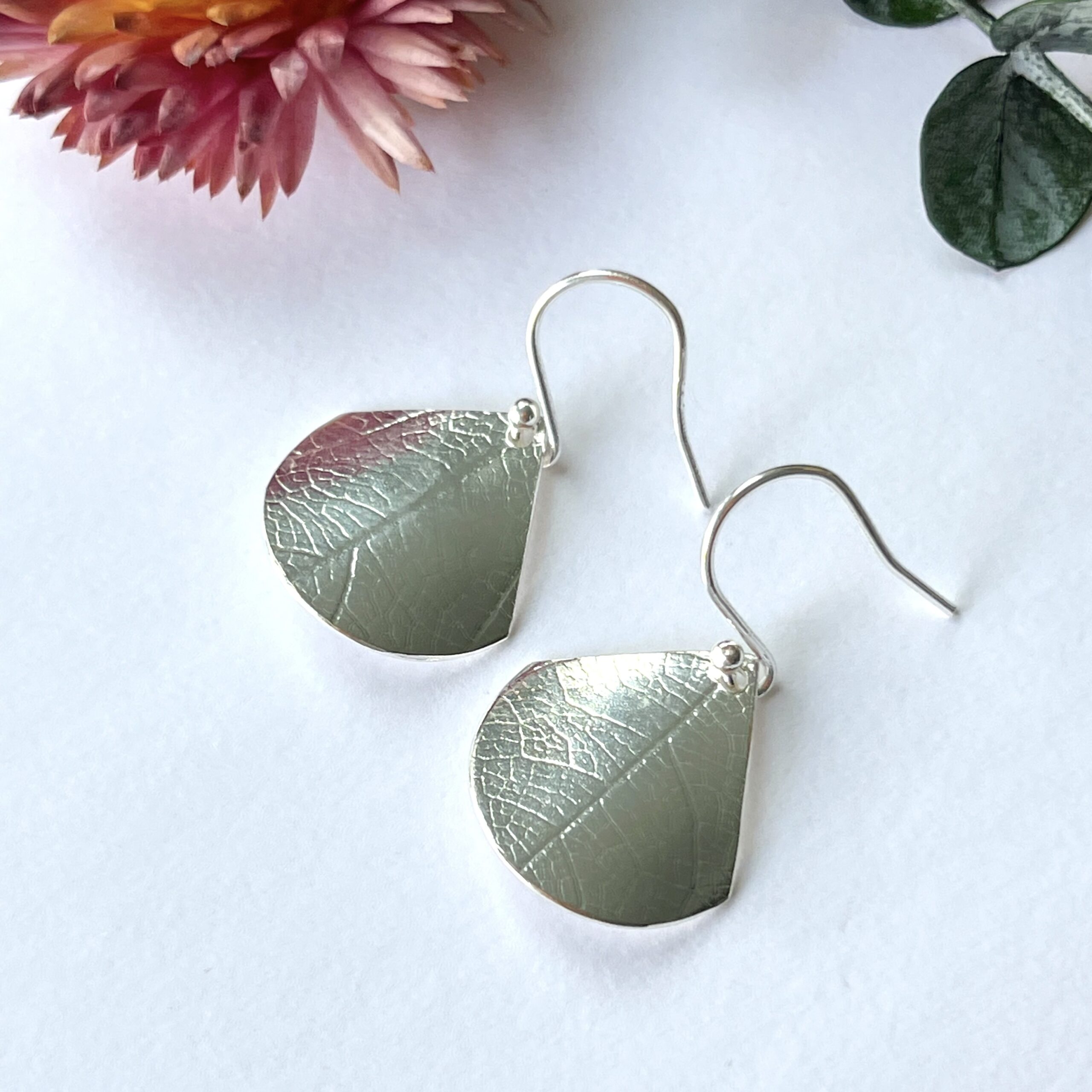 Sterling silver dangly fan earrings, with a lovely leaf print. They are slightly curved and the surface has a lined leaf texture which catches the light as you move.