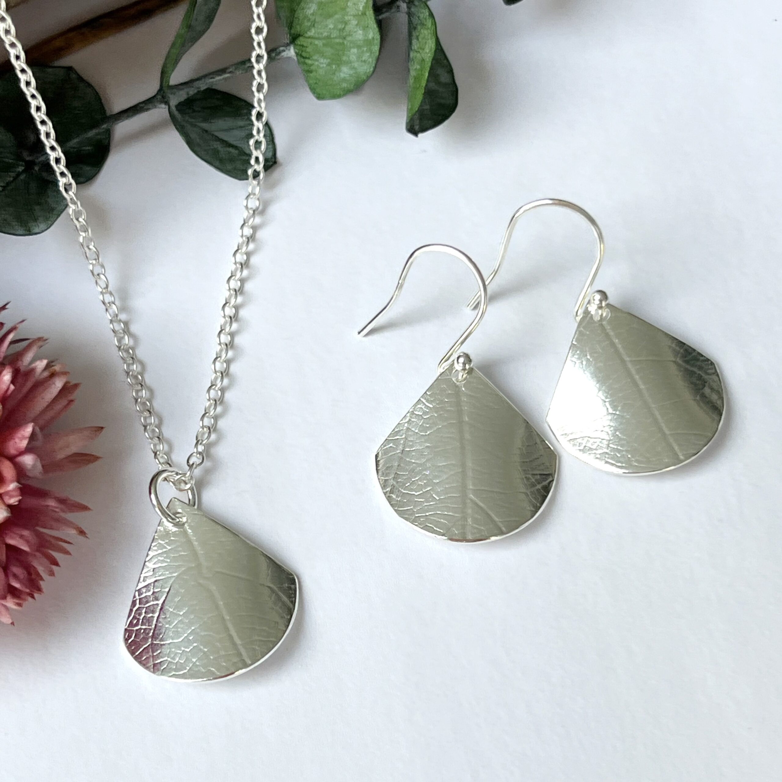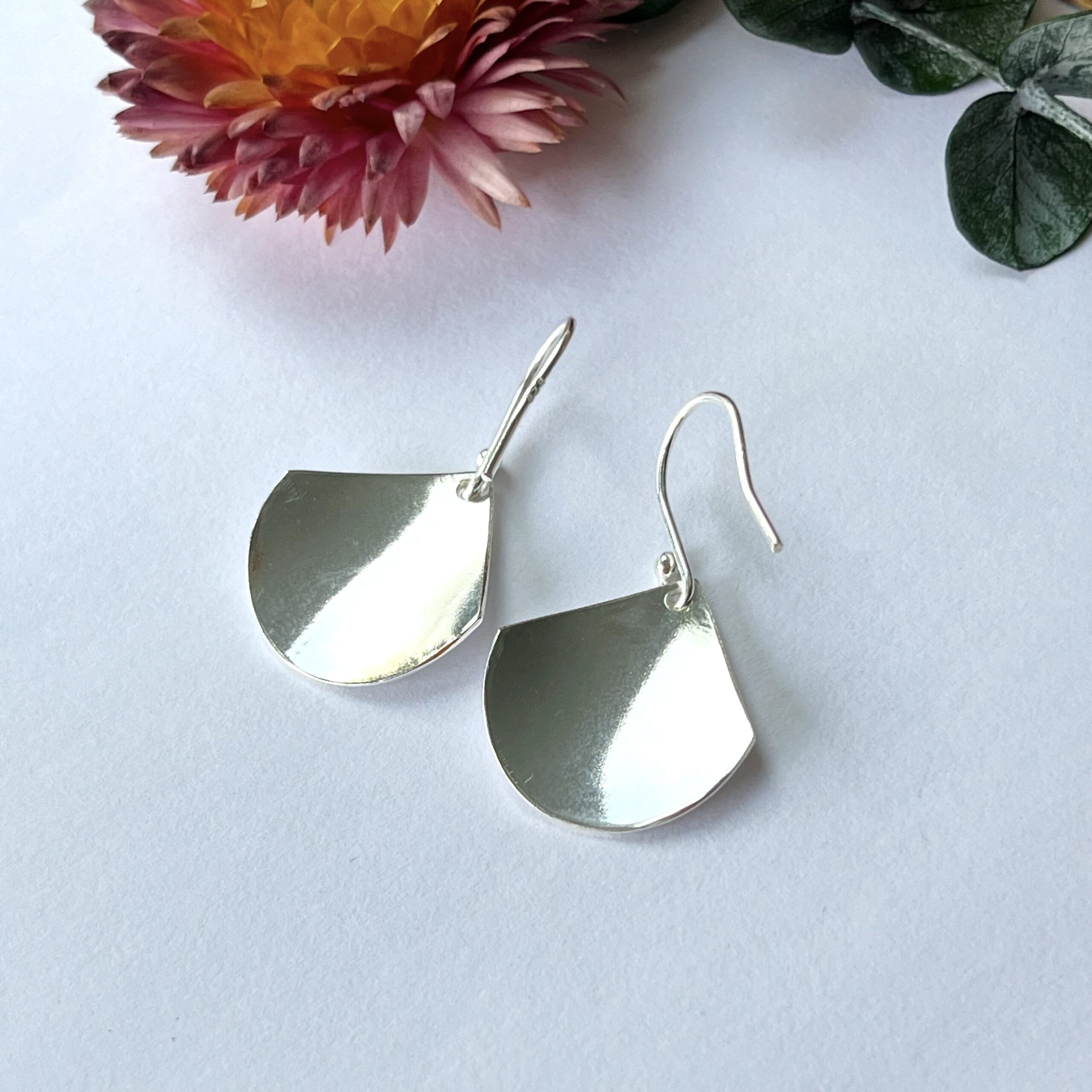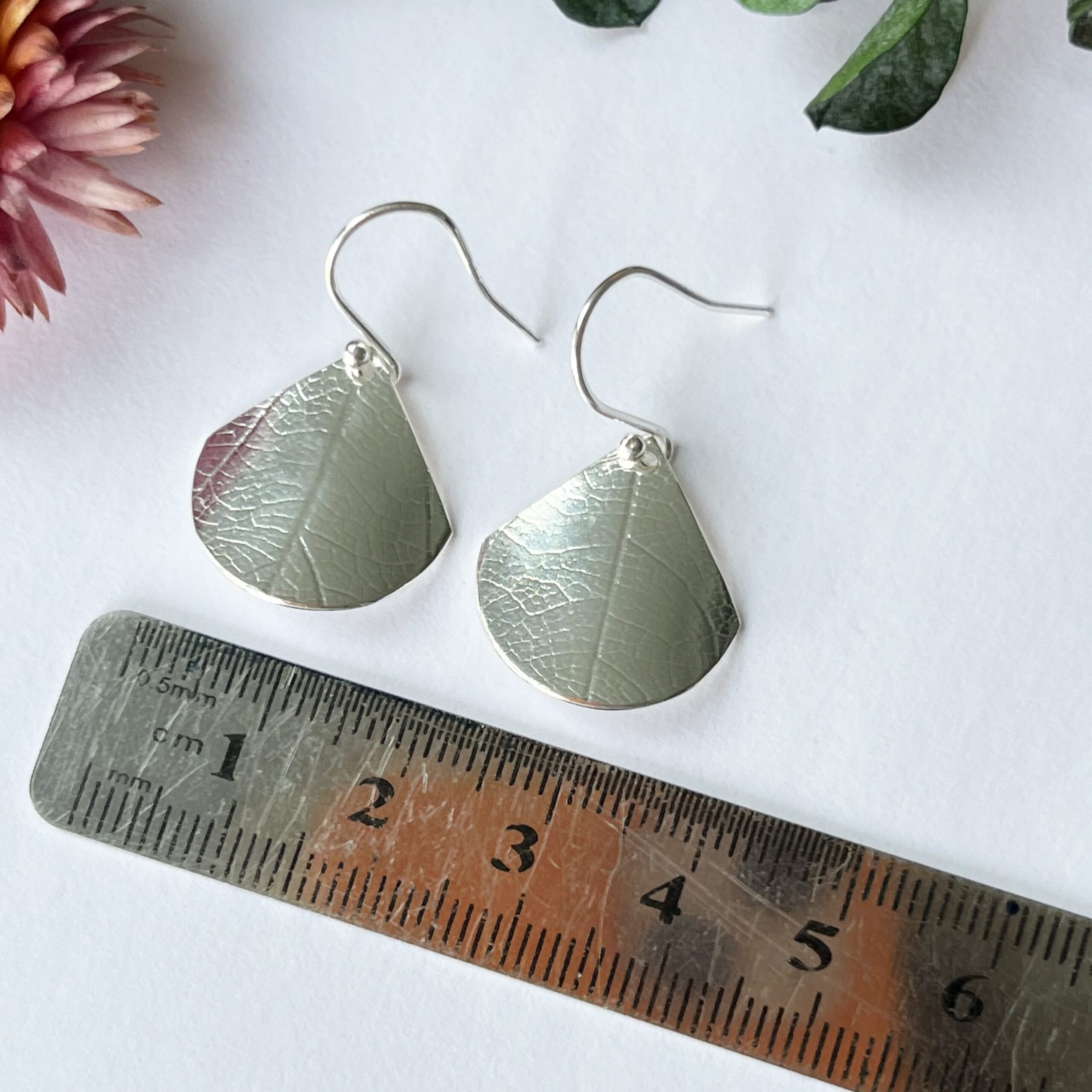 Sterling silver dangly fan earrings, with a lovely leaf print. They are slightly curved and the surface has a lined leaf texture which catches the light as you move.